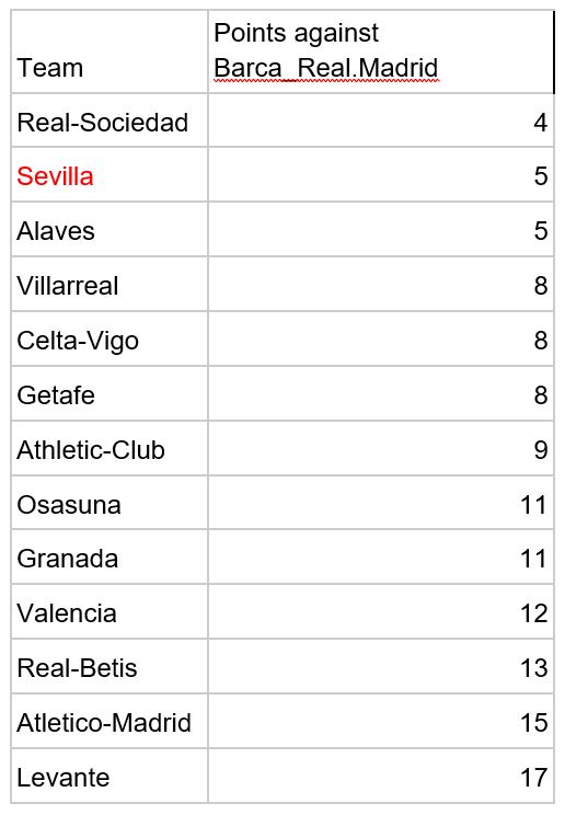 1. כל הקבוצות שהתמודדו עם ריאל מדריד וברצלונה בליגה הספרדית ב-4 העונות האחרונות בהתאמה (48 נקודות בקופה) וכמה נקודות הן לקחו.