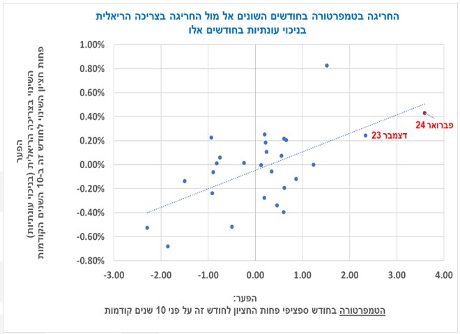 מזג האוויר החם יחסית השפיע לטובה על הפעילות הכלכלית וגרם להפתעות חיוביות בנתונים. היגיון אומר כי ככל שהחורף פחות קר - הצרכנים יטו לבלות ולצרוך יותר והפעילות הכלכלית, לפחות בחלק מהמגזרים, תהיה חזקה יותר. החלטנו לבחון האם הערכה זו גם מתממשת בנתונים עצמם. לצורך כך בחנו את שיעור השינוי בכל חודש בהוצאה לצריכה פרטית במונחים ריאליים ובניכוי העונתיות הרגיל. בכדי לבצע השוואה נכונה ומדויקת עוד יותר בחנו את הפער שבין השינוי בהוצאה הריאלית בכל חודש ספציפי (בניכוי עונתיות) מול השינוי החציוני בעשור החולף לאותו חודש ספציפי. נתונים אלו השווינו לניתוח דומה לגבי הטמפרטורה, כלומר לפער שבין הטמפרטורה בכל חודש ספציפי לעומת החציון ההיסטורי של הטמפרטורה לחודש זה. באופן זה ההשוואה מאפשרת לבחון בכל חודש ספציפי את הקשר שבין טמפרטורה חריגה מהעונתיות ובין צריכה חריגה מהעונתיות.