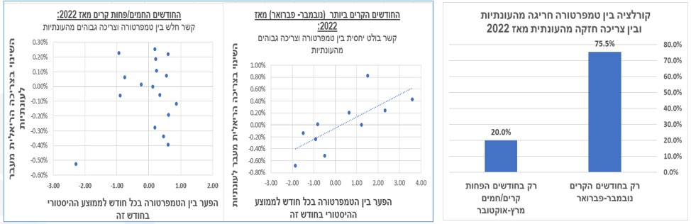 למזג אוויר חם מהרגיל יש יותר השפעה על חודשי החורף ופחות השפעה על יתר החודשים. לכאורה ניתן לטעון כי בשל התחממות כדור הארץ מזג האוויר החם יחסית יתמוך בכלכלה ובצריכה באופן עקבי גם בחודשים הבאים. אולם ההיגיון אומר כי יש הבדל בהשפעה של החריגה בטמפרטורה על הצריכה בחודשים המאוד קרים (נובמבר עד פברואר) ובין ההשפעה של החריגה בטמפרטורה בחודשים שבמילא פחות קרים/חמים (מרץ עד אוקטובר). בחנו עניין זהעל ידי בחינת הקשר שבין חריגות בטמפרטורה וחריגות בצמיחה מאז תחילת 2022 רק בחודשי החורף (נובמבר-פברואר), לעומת הקשר ביתר החודשים.
