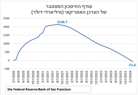 באומדן האחרון שפרסם הפד' עלה כי"ההר העצום" של עודף החיסכון הגיע למיצוי לראשונה במרץ 2024, כלומר עודף החיסכון הפך לשלילי. נסייג ונאמר כי חישוב עודף החיסכון איננו טריוויאלי ועשוי להשתנות באופן ניכר לפי אופן החישוב שלו. בכל זאת, ולפחות לפי האומדן של שלוחת הפד' בסן פרנסיסקו, גורם חשוב שתמך בצרכן האמריקאי כבר מוצה.