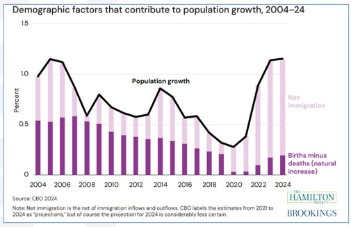לפי מחקר של The Brookings Institution and The Hamilton Project אוכלוסיית ארה"ב צפויה לגדול ב-2024 בעיקר בשל ההגירה. שיעור הגידול באוכלוסייה יהיה גבוה באופן מזערי בהשוואה ל-2023, כלומר עליית המדרגה תהיה מתונה בהשוואה לעליית המדרגה הניכרת יותר שנרשמה בין 2022 ל-2023. פוטנציאל ההפתעה לטובה בצמיחה בשל ההגירה עדיין קיים, אך נראה כי הוא מתון בהשוואה לשנה החולפת. יתר על כן במבט ל-2025 וצפונה קיימת אי וודאות בהקשר זה על רקע אי הוודאות לגבי זהות הנשיא הבא והמדיניות שתנקוט בעתיד ממשלת ארה"ב לגבי ההגירה. נסייג ונאמר כי האומדנים לגבי היקף ההגירה הינם אומדנים בלבד ובעבר אף היו עדכונים חדים כלפי מעלה באומדנים אלו.