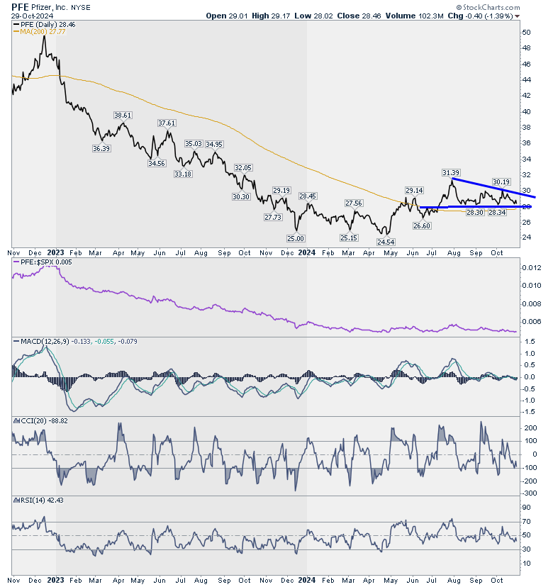 גם PFE מבקרת אותנו תדיר. יש תמיכה חזקה, גם מעל ממוצע ל – 200 יום, ותבנית משולש שלאור התמיכה החזקה סביר שמתי שהוא תיפרץ למעלה. אפשר לרכוש מעל תמיכה ב – 28.3 ולהגדיל בפריצה. 6% דיבידנד מקלים מאוד על תקופת ההמתנה.