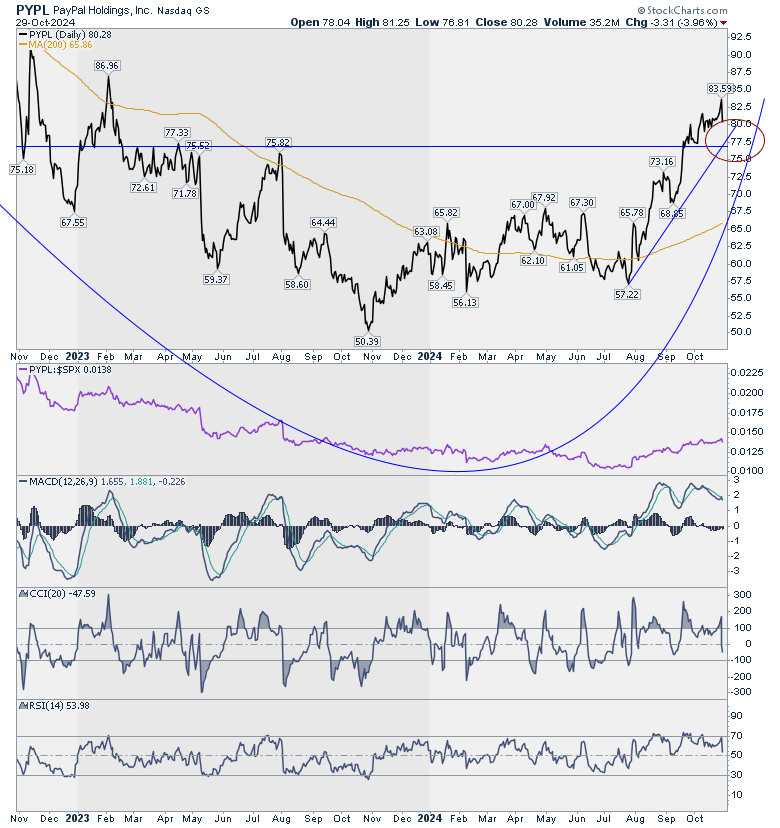 את PYPL זנחתי קצת דווקא מהמקום העסקי כי אני לא קורא / יודע על דברים מעניינים שקורים שם. אבל, זה היופי בניתוח הטכני. צריך לראות מה קורה ולא חייבים לדעת למה. פעמים רבות ה – למה מגיע באיחור. יש תבנית התעגלות יפה שמשמעותה שהכוח עבר מהמוכרים לקונים. סימנתי בעיגול את אזור הקניה.