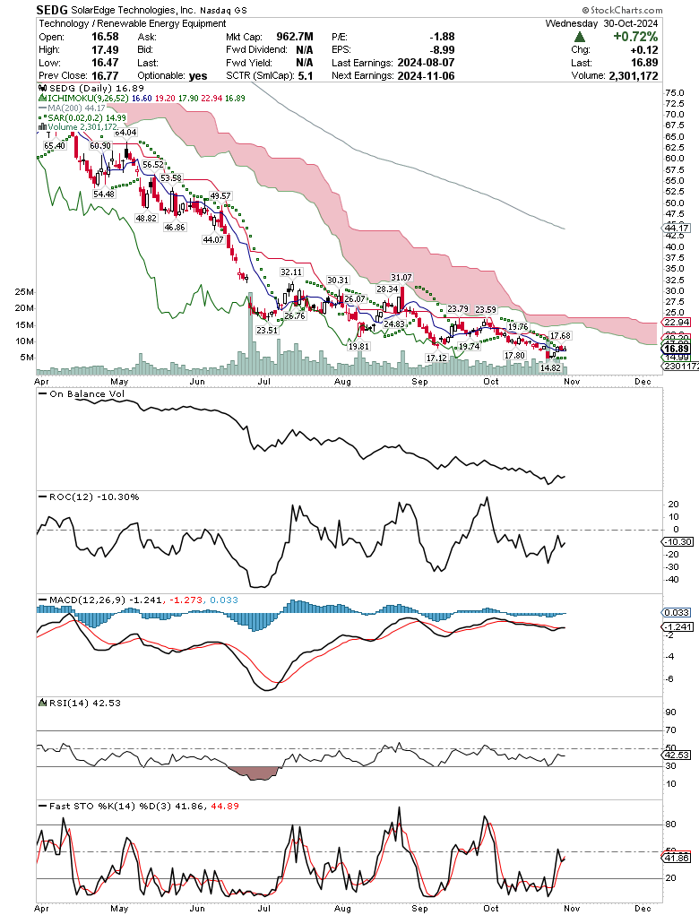 את SEDG זנחתי כאן מזמן ולאור שאלה שנשאלתי פתחתי את הגרף ואני רואה שטוב שעזבנו אותה. תזכורת לאכזריות של ירידות שערים. נכון לעכשיו יש סימני התעוררות לטווח הקצר. מי שחושב שכלכלית היא מעניינת יכול לבדוק קניה מעל 16.4 אם תישאר מעל הרמה הזו. לטווח הארוך יותר יידרש מהלך מעל 24 דולר, פלוס מינוס, בשביל לאשר שינוי מגמה.