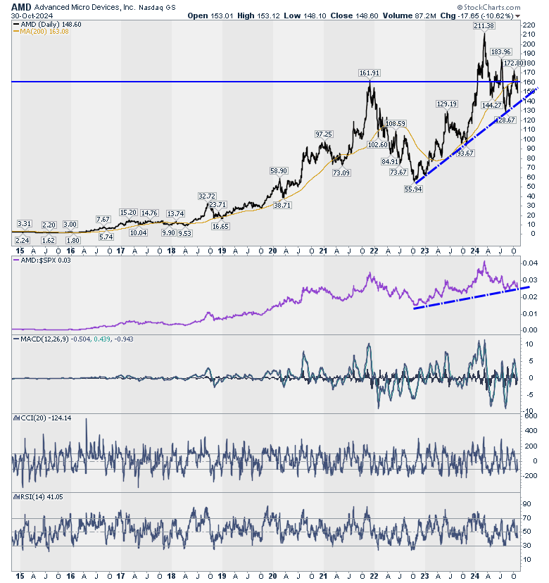 ואם כבר INTC אז גם AMD אחרי הדו״ח. הוא לא הוציא אותה ממסלול העליה לטווח הארוך וגם לא ממסלול ההתחזקות מול – S&P500. אם תחזור מעל 155 דולר זה יהיה סימן קניה.