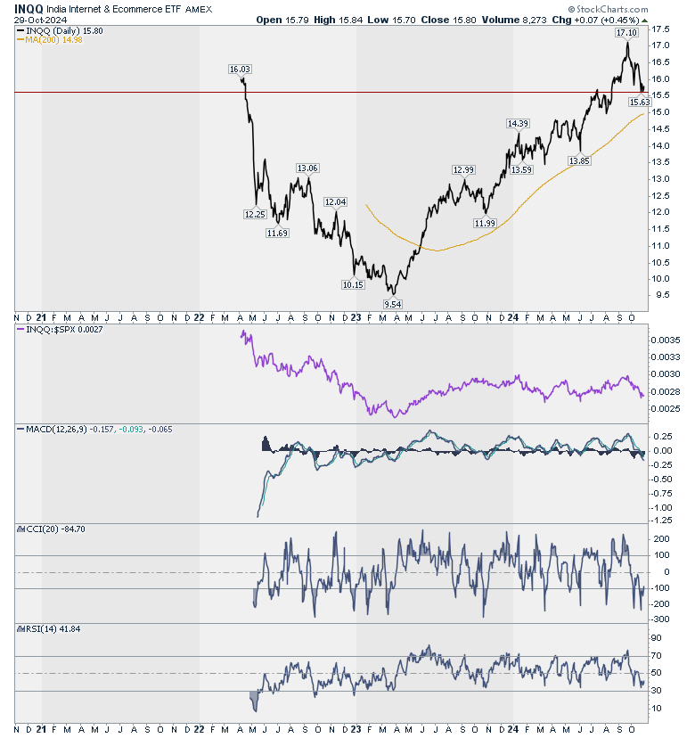 שתיהן נמצאות במגמת עליה ארוכת טווח. לא מכיר את החברות הכלולות בכל אחת ואת הניואנס של ההבדלים בינהן. הקרן הכללית להשקעה בהודו, INDA עדיין במגמת עליה אחרי שתיקנה למטה ונתמכה מעל הממוצע ל – 200 יום. מוסיפים את הודו לרשימת האפשרויות.