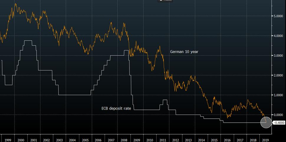 תשואות האג"ח של גרמניה ל-10 שנים מול הריבית על הפיקדונות של ה-ECB: הורדת הריבית באירופה קרובה מתמיד